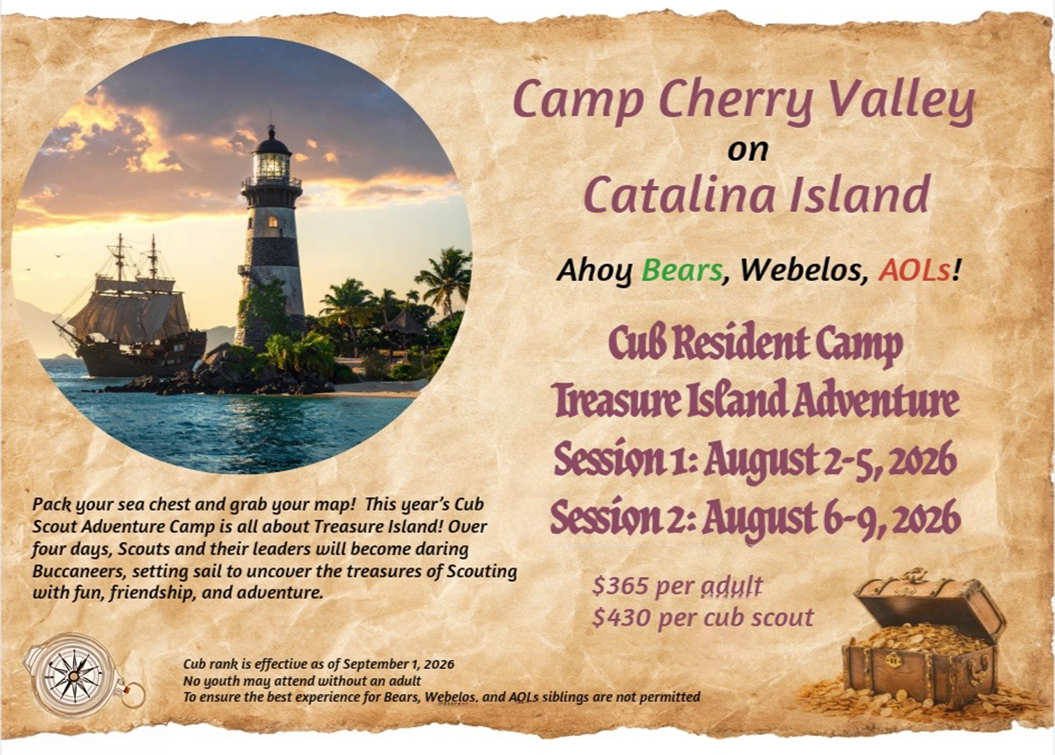 Pack your sea chest and grab your map! This year’s Cub Scout Adventure Camp is all about Treasure Island! Over four days, Scouts and their leaders will become daring Buccaneers, setting sail to uncover the treasures of Scouting with fun, friendship, and adventure.