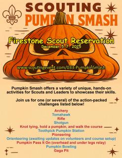 Got leftover Halloween pumpkins? Bring them to Firestone and watch them meet their ultimate fate at Pumpkin Smash 2025! This high-energy Scouting event combines outdoor adventure with eco-friendly recycling—turning Jack-O-Lanterns into flying pieces and unforgettable memories.