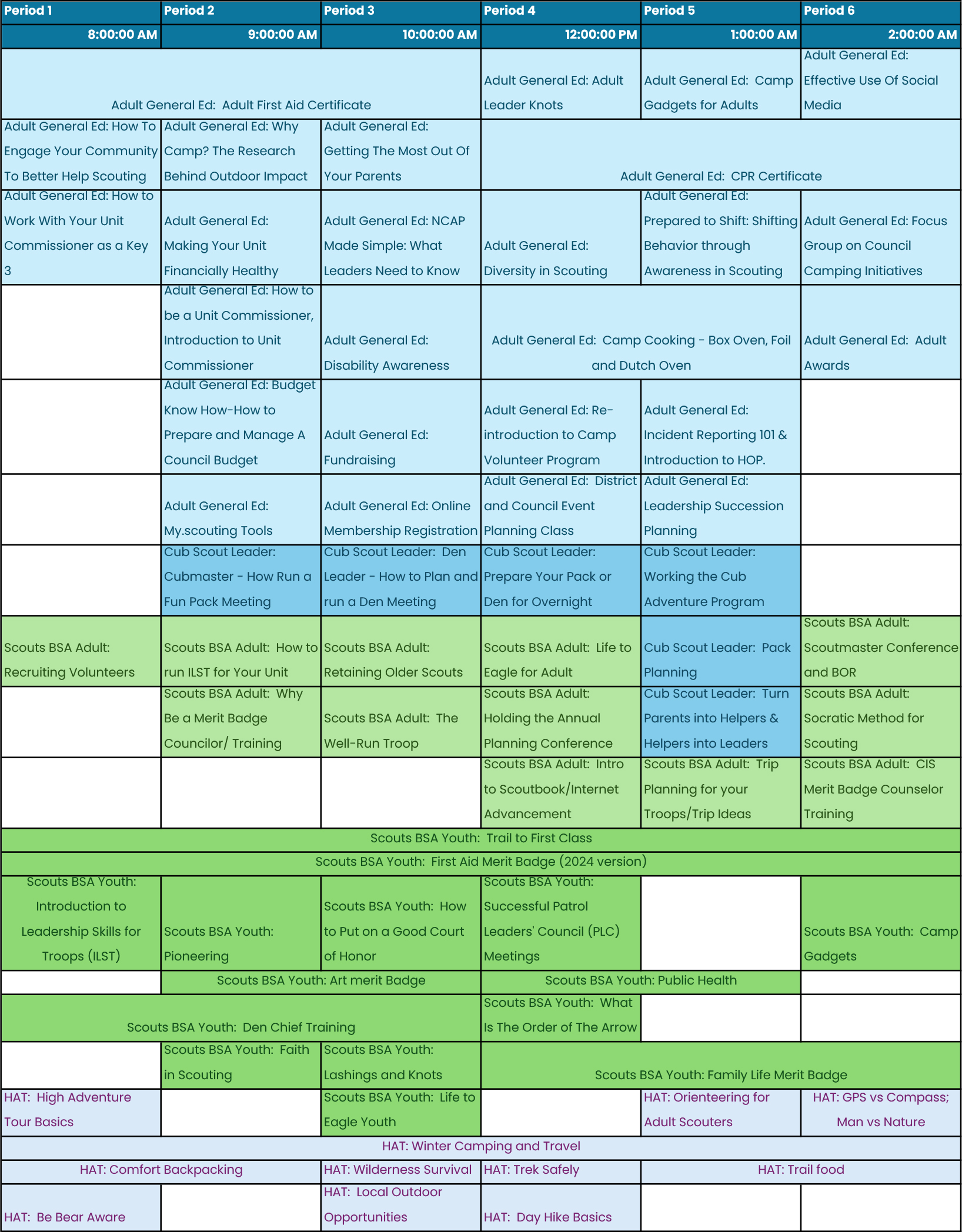 University of Scouting is a dynamic, fun-filled day of immersive learning, where you can choose up to five classes from our diverse course catalog. Each session is led by experienced Youth and Adult Scouters who are selected for their expertise, enthusiasm, and engaging presentation skills. Don’t miss this opportunity to connect with fellow Scouters and elevate your Scouting experience!