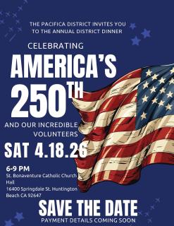 Please join us for our2026 Pacifica District DinnerCelebrating America's 250thHonoring our 2025District Award of Merit, Unit Exc...