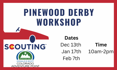 Come to Donald E. Scott Colorado Adventure Point for our Pinewood Derby Workshop! We will be there to help your Cub Scout design, cut out, sand, decorate, and test their car on our tracks. This is a great opportunity for Cub Scouts to work on their cars, as we know not everyone has these tools available or knows where to start.