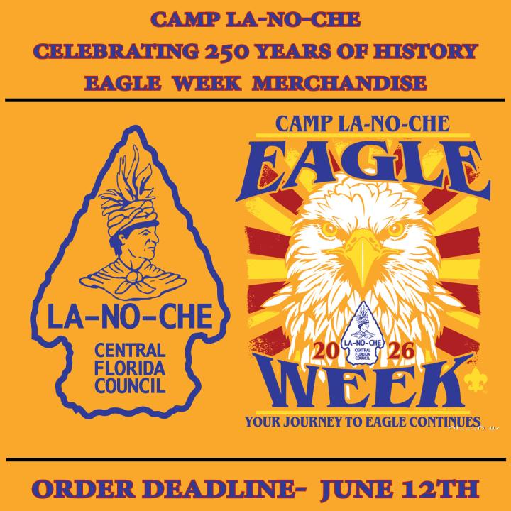 Eagle Week is held at Camp La-No-Che during Summer Camp and is its own stand-alone program. Scouts attend as individuals and Troops are formed from all participants. Adult Staff members fill the roles of Scoutmaster and Assistant Scoutmaster during the week and provide supervision. Participants take Eagle Merit Badge programs of their choosing in the morning and afternoon, and in the evening are invited to engage in special Troop Time Activities arranged through various camp program areas including: Adventure Camp, Aquatics, & Shooting Sports.