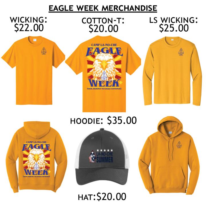 Camp La-No-Che Eagle Week participants will recieve (1) Eagle Week T-Shirt (50/50 Blend) as a part of their registration fee. This shirt must be worn on Wednesday while at camp. On this day Troop Pictures will be taken, and Scouts will be leaving for their Field Trip. Participants wishing to order additional shirts and swag may choose to do so through the registration page. Make sure to purchase your shirt before the deadline. Orders can be placed starting now, and must be placed by June 12th! Our Camp Trading Post will stock several varities and options of Camp La-No-Che swag. Unfortunately the below shirt is only available as a pre-order, and available exclusively to Eagle Week participants and staff. Please plan purchases accordingly prior to your visit.