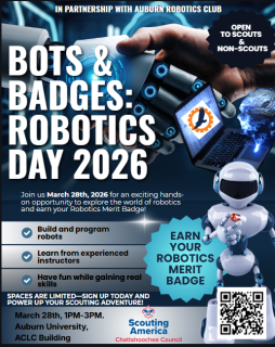 Join us on March 28, 2026 for an exciting, hands-on STEM experience where Scouts will explore the world of robotics and work toward earning their Robotics Merit Badge!
