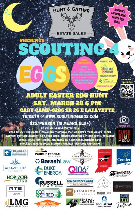 Let’s have fun like the kids do!! The 8th Annual Scouting 4 Eggs Adult Easter Egg Hunt registration is open for 2026 Hunters! This adult only hunt will take place on Saturday, March 28th, 2026 at Franklin L. Cary Camp.
