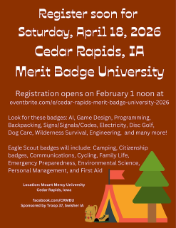 Cedar Rapids Merit Badge University Sponsored by Troop 37, Swisher, IA Date: 4/18/2026 Time: 8:00am - 4:30pm Where: Mount Mer...