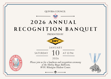 Please join us for Quivira Council’s Annual Recognition Banquet as we celebrate the achievements of our 2025 Eagle Scouts and recognize volunteers who have represented Scouting with extraordinary leadership and service within their units and communities.