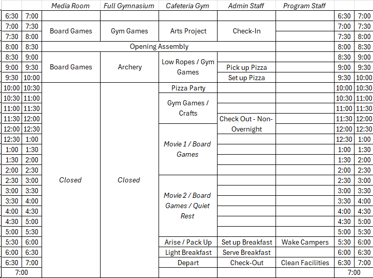 Due to insurance limitations, the overnight program is limited to youth in second grade and up. Kindergarten and First-Grade youth are welcome to join us for the evening-only portion.