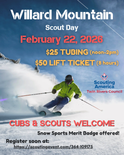 Skiers! Boarders! Tubers!Carve some turns on the trails, or zip downhill in the tubing park!SCOUT DAY discounts at WILLARD MOUNT...