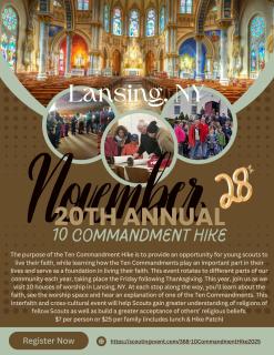 Participants meet at a designated house of worship, register, and have one commandment explained by the pastor or the pastor's designee. Then Scouts and others "hike" to each of the remaining 9 houses of worship, where another commandment will be discussed and a little about the faith/denomination/parish/worship community will be explained. At the end of the hike, participants will receive a 10 Commandments Hike patch, will be aware of Scout religious awards and will have a basic understanding of the 10 Commandments. The hike will include 10 different churches covering multiple denominations in and around the Lansing area. The starting point will be at Asbury Church, 2978 N. Triphammer Rd., Lansing, NY.