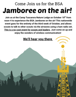 Join us at the Camp Tuscarora Nature Lodge on October 18th from Noon-4PM to experience the Scouts BSA Jamboree on the Air! This anationwide event goes for the entirety of the the third week of October, and allows scouts to talk to other scouts via the airwaves using a HAM radio set. This is a no-cost event for scouts and leaders. Just come on out and enjoy the wonders of wireless communication!