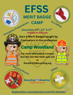 Learn & Earn E Prep, Fire Safety, Safety & Search & Rescue Merit Badges over three Saturdays in December, 9 am - 4 pm.