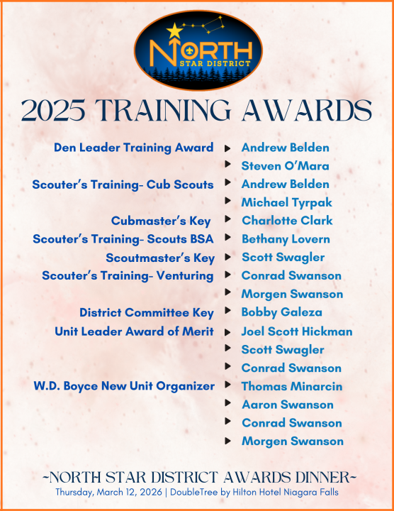 A special evening to thank Scouts and Scouters for their dedication to Scouting. We honor District Award of Merit recipients and other special annual “of the Year” recipients as well as the "Star of the North" Award.