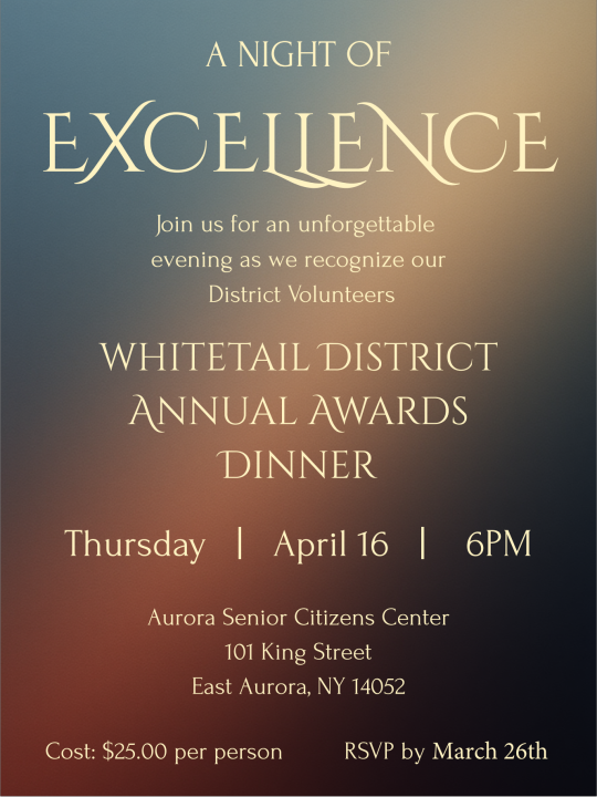 - District Volunteer of the Year- This Award goes to a registered leader or non-registered Adult that has given of his/her time and energy to keep Scouting going in our Troops, Packs, or within Whitetail District.