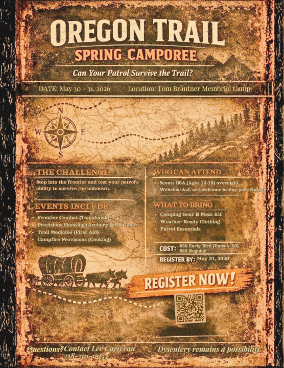 Scouts from across the council will gather to test their skills in hands-on frontier challenges focused on teamwork, leadership, and the patrol method. From fire-building to outdoor problem-solving, Scouts will experience the spirit of the pioneers while connecting with fellow Scouts from neighboring districts. Scouts BSA camp overnight; Webelos/AoL are welcome as day participants. Get ready to blaze new trails, build skills, and make memories at the Prairie and Pines Spring Camporee!