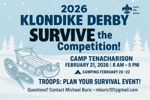 2026 Laurel Hills District Klondike Derby – Friday, February 20th, to Sunday, February 22nd, 2026.Get ready to test your skill...