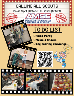 Join us for a fun and relaxed evening of STEM and cinema at the American Museum of Science & Energy! Families are invited to arrive early to enjoy pizza before settling in for a movie together. Each registered youth will receive a snack box to enjoy during the film, making it the perfect night to sit back, relax, and enjoy time with fellow Scouts and families.