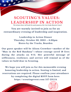On behalf of the Great Smoky Mountain Council, Scouting America, you are invited to partner with us as a sponsor of our Leadership in Action Dinner, featuring Alison Crowther, Founder of the Welles Remy Crowther Charitable Trust.