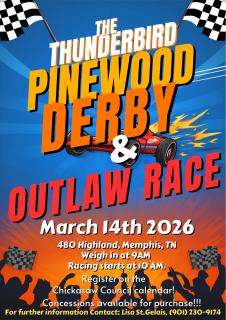 Thunderbird District Pinewood Derby will be held at on Saturday, March 14, 2026.Check-in begins at 9AMRaces begin at 10 AM