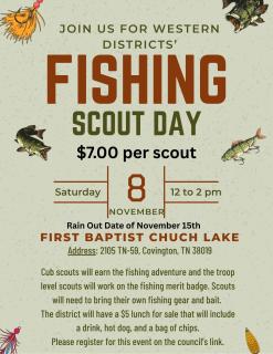 Cub Scouts will have the opportunity to earn their fishing adventure while Troop Scouts will work on their fishing merit badge. Scouts will need to provide their own gear and bait.