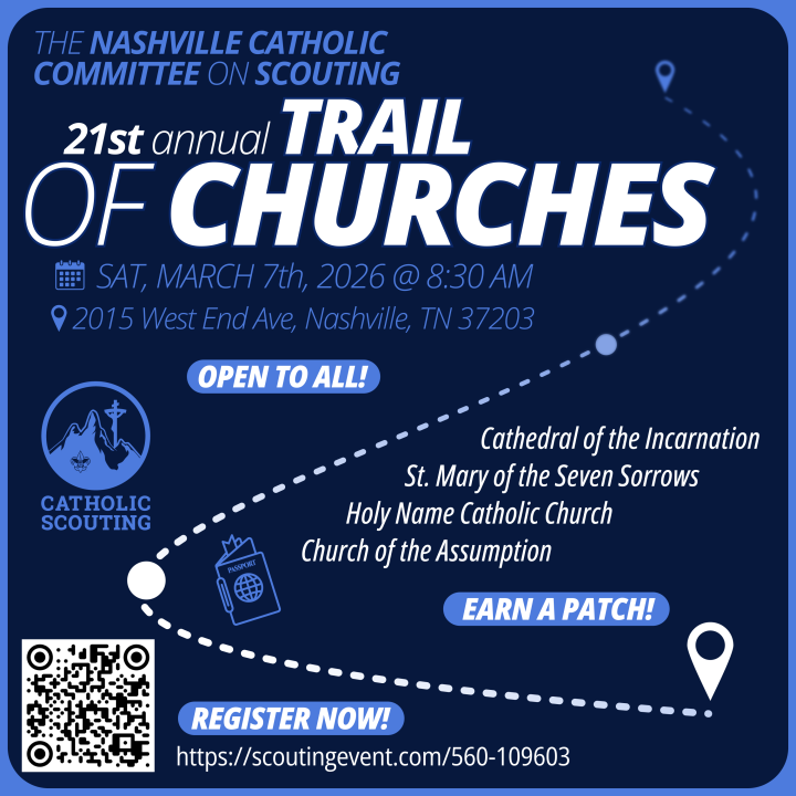 We’re glad you’re here. The Trail of Churches Tour offers Scouts, leaders, families, and all interested participants a meaningful journey through some of Nashville’s most historic Catholic parishes. Together, we’ll explore our city’s rich heritage, deepen our understanding of the faith tradition, and participate in a day of learning, fellowship, and service.