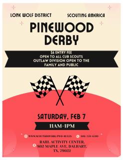 Please join us for the Lone Wolf District Pinewood Derby on Saturday, February 7th from 11AM-1PM!