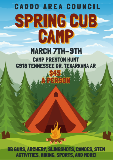 Join us for two days of fun March 7th - 9th! Get ready to participate in stem activities, go on a treasure hunt hike, play some sporting events, and participate in a flag retirement ceremony! Spend two nights in a tent or cabin! Scouts will get an opportunity to earn their archery, BB gun, slingshot, and one other stem adventure! Don't miss out on all the fun at Camp Preston Hunt 6918 Tennessee Rd Texarkana AR 71854.