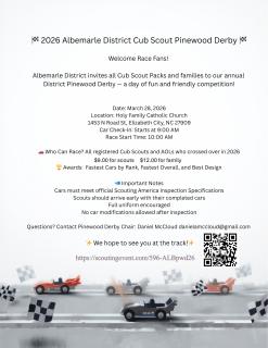 Come one, Come all, for a fun filled day of racing!Derby Eligibility: All racers of each rank from every pack in Albemarle Dis...