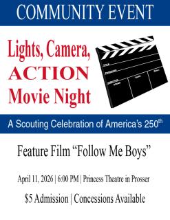 Lights, Camera, ACTION: Movie NightA Scouting Celebration of America's 250thFeatured Film "Follow Me Boys"April 11, 2026 | 6:00 ...