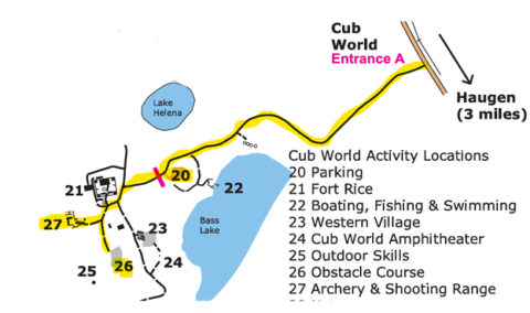 - Enter camp at the Cub World Entrance (Entrance A), located at fire number 2836 16th Street, Rice Lake, WI 54868 (County Highway VV).