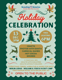 Mark your calendars for Saturday, December 13th from 3:00PM to 6:00PM for an evening of holiday fun at Pouch Scout Camp. Photos with Santa, Arts and Crafts, Carnival Games, Campfire with S'more, hot coco and more! Be sure to stick around for the grand finale Holiday Tree Lighting at 6pm Sharp! Camp Pouch will also be hosting the annual wreath and tree sale as well.