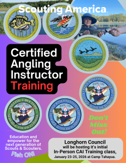 This Certified Anging Instructor Class is being hosted by the Longhorn Council Fishing Committee & TPWD and will be held in person. Class is January 23rd. 6:00pm to January 25th. 12:00pm