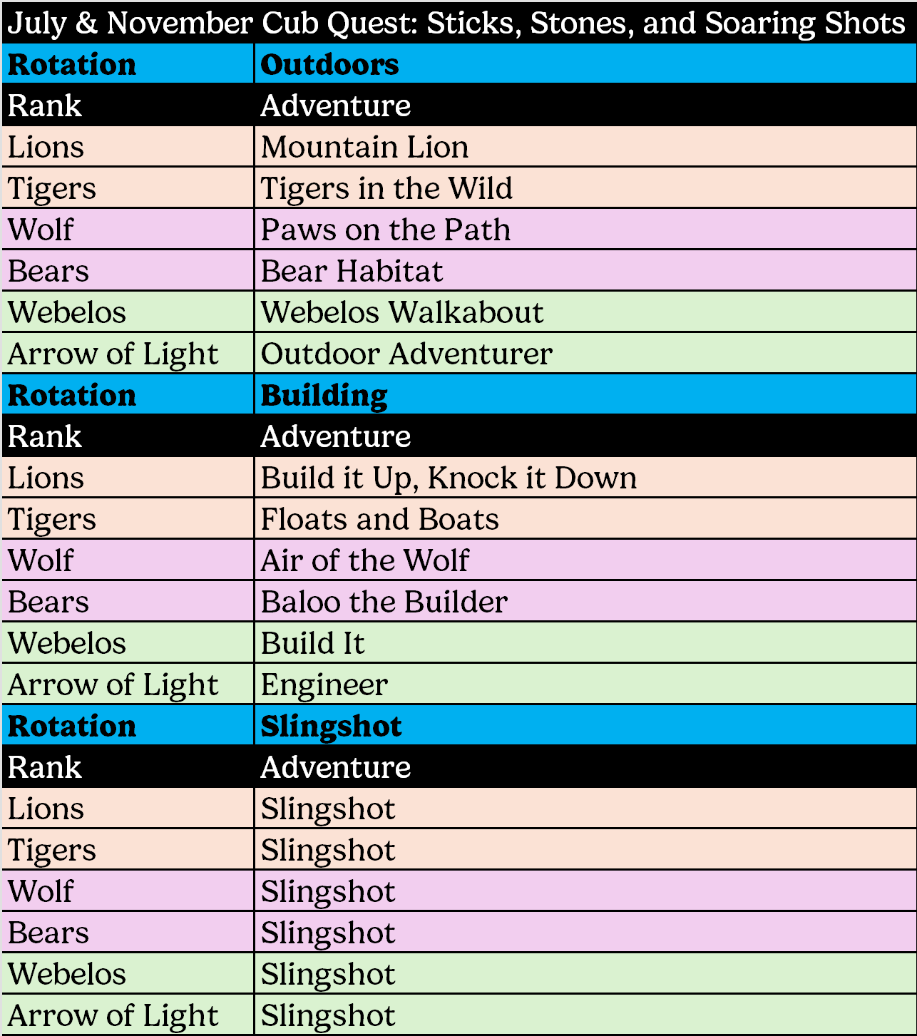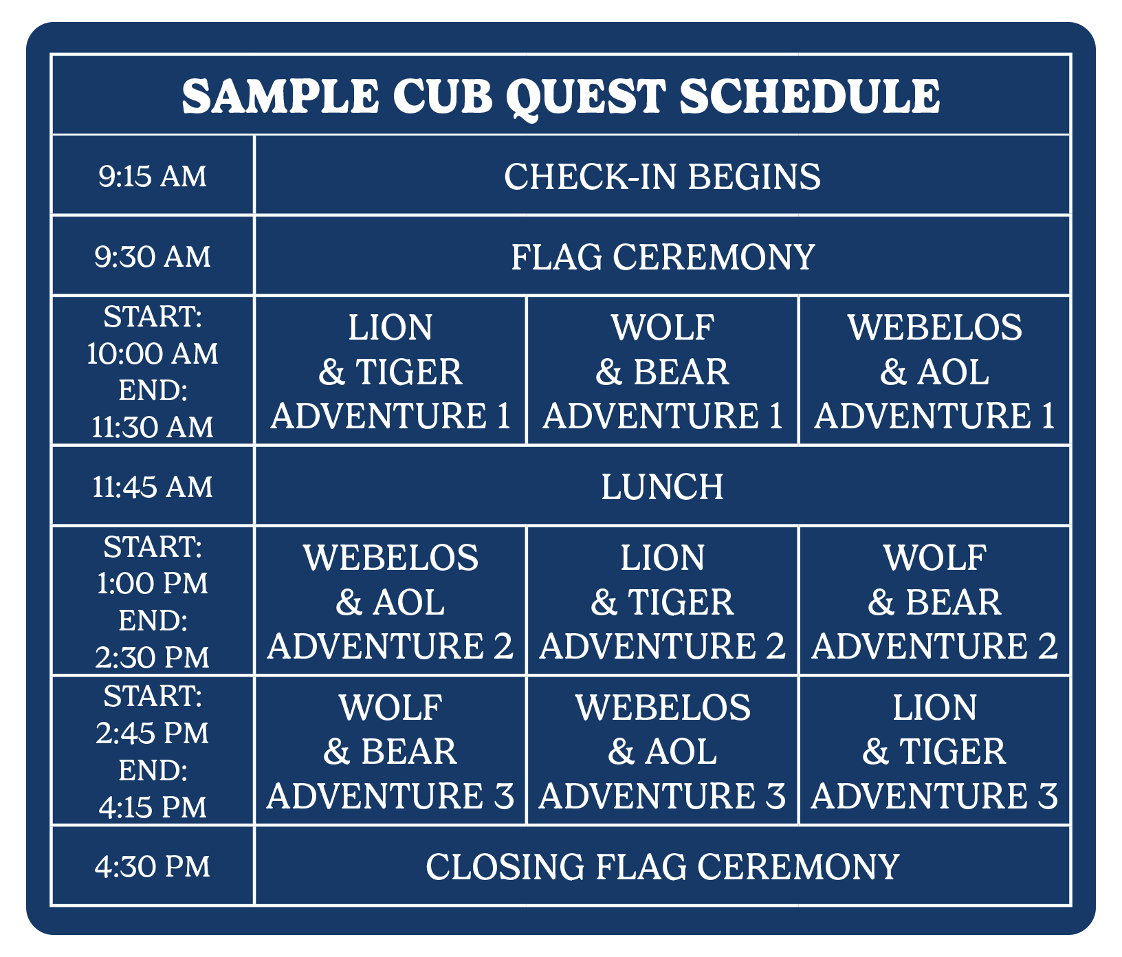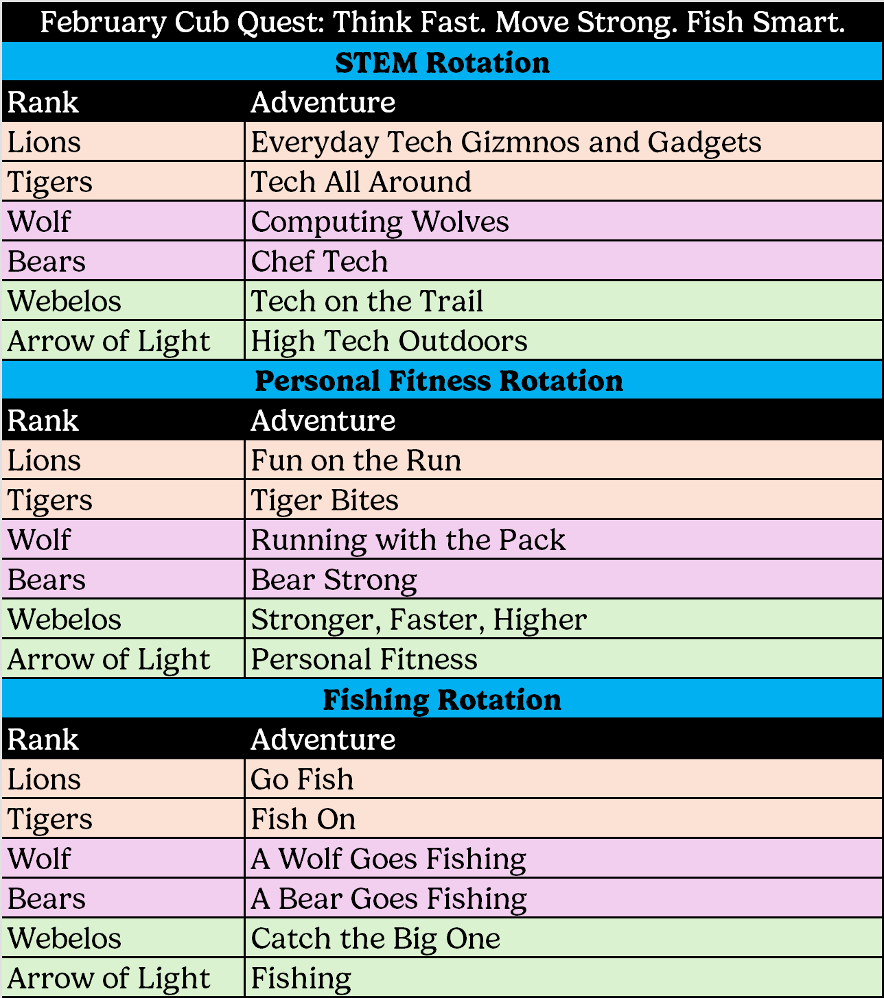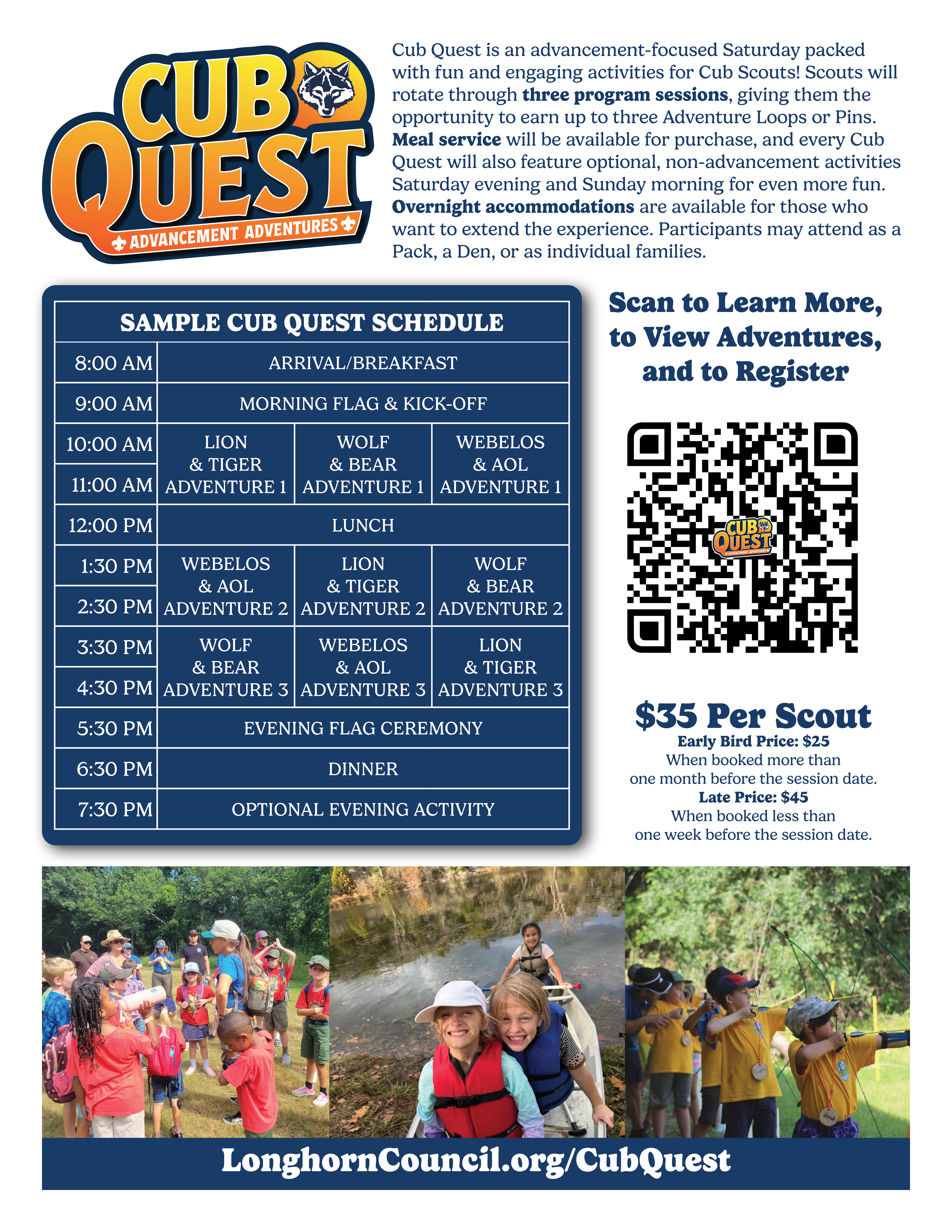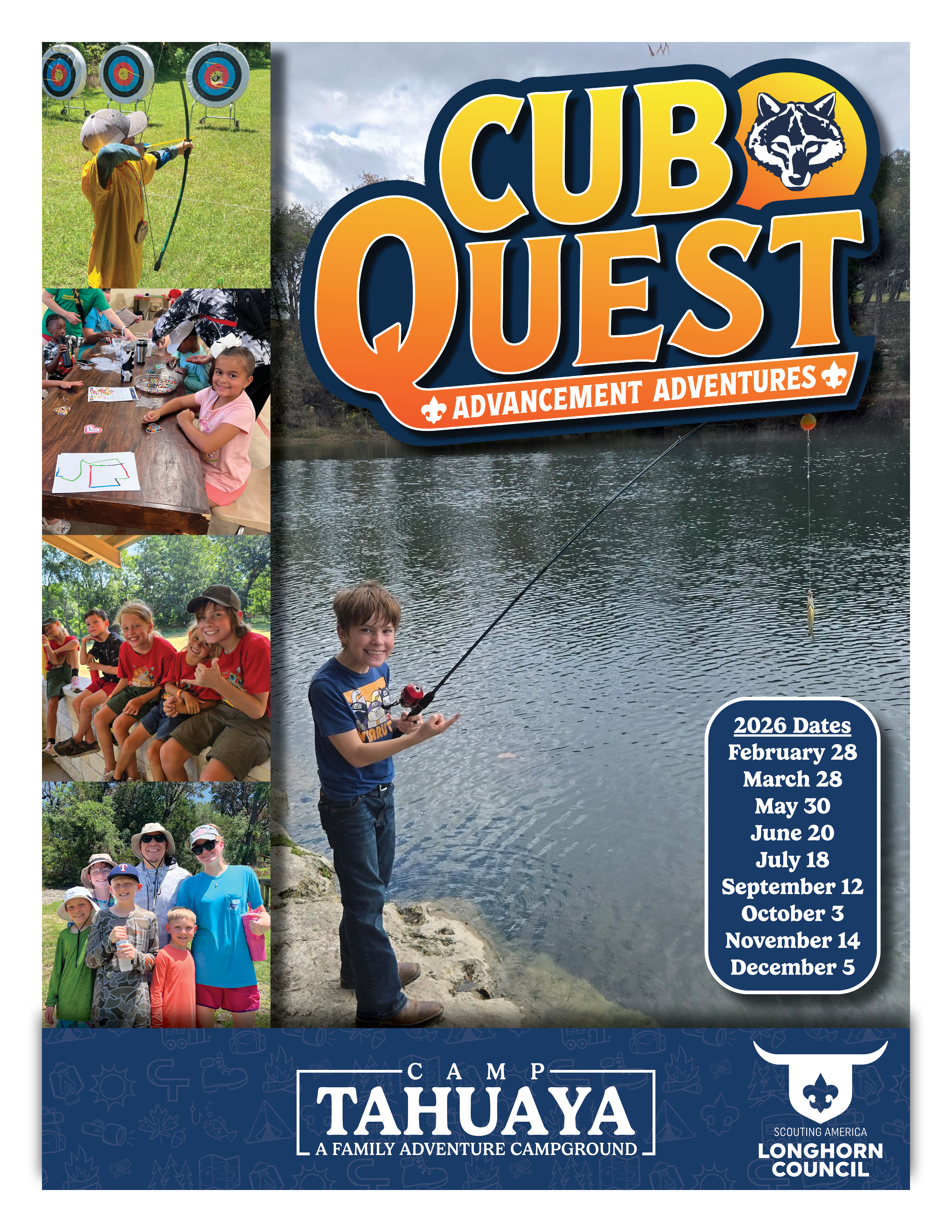 Cub Quest is an advancement-focused Saturday packed with fun and engaging activities for Cub Scouts! Scouts will rotate through three program sessions, giving them the opportunity to earn up to three Adventure Loops or Pins. Meal service will be available for purchase, and every Cub Quest weekends will also feature optional, non-advancement activities Saturday evening and Sunday morning for even more fun. Overnight accommodations are available for those who want to extend the experience. Participants may attend as a Pack, a Den, or as individual families.