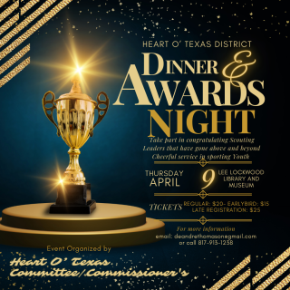 Please help us celebrate you and your accomplishments this year at the Heart O' Texas District Recognition Dinner. Awards to be presented include the District Award of Merit, Cubmaster and Scoutmaster of the Year, Training Awards, and many others. Send in your pictures to help us highlight your unit in our YEAR IN REVIEW presentation.