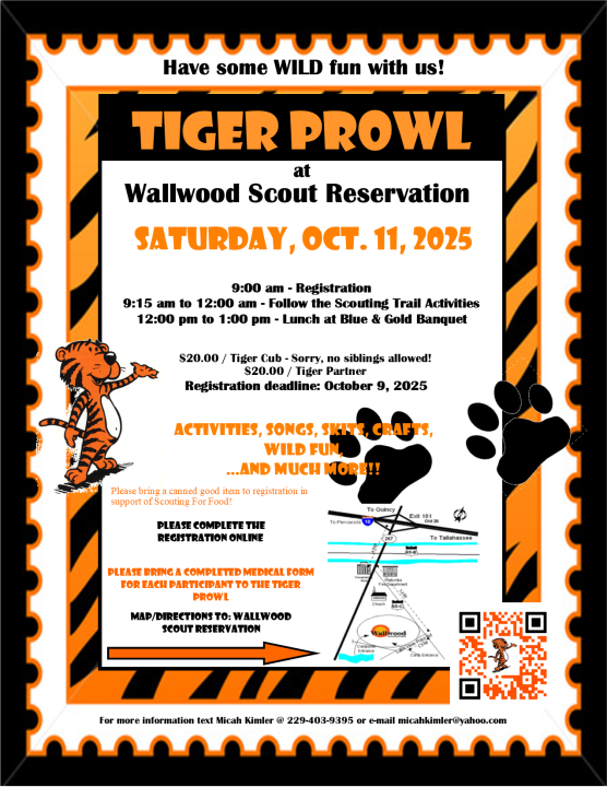 Come join us on the trail to scouting at the Tiger Prowl! All Tiger Cubs (first graders) and their Adult Partners are invited to come out to Wallwood, take a tour of camp and meet other scouts from around the council.