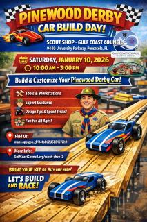 Pinewood Derby Car Build DaySaturday, January 10, 202610:00AM-3:00PMGulf Coast Council Scout Shop9440 University PkwyPensacola, ...