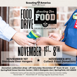 - Ozark Trails Council (1616 S. Eastgate Ave.) November 1st - November 8th.