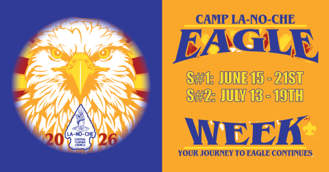Eagle Week is held at Camp La-No-Che during Summer Camp and is its own stand-alone program. Scouts attend as individuals and Troops are formed from all participants. Adult Staff members fill the roles of Scoutmaster and Assistant Scoutmaster during the week and provide supervision. Participants take Eagle Merit Badge programs of their choosing in the morning and afternoon, and in the evening are invited to engage in special Troop Time Activities arranged through various camp program areas including: Adventure Camp, Aquatics, & Shooting Sports.